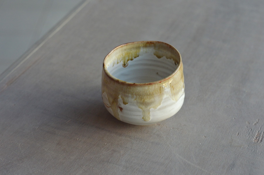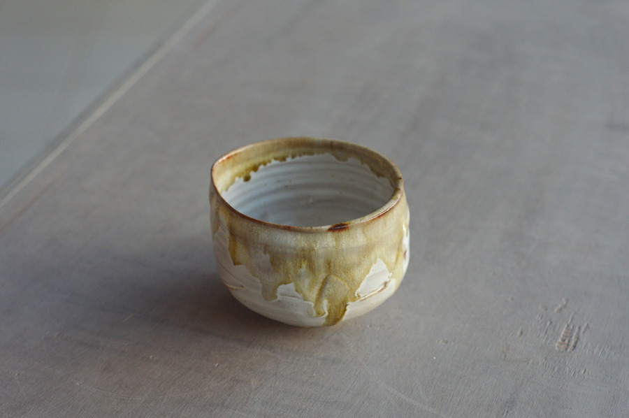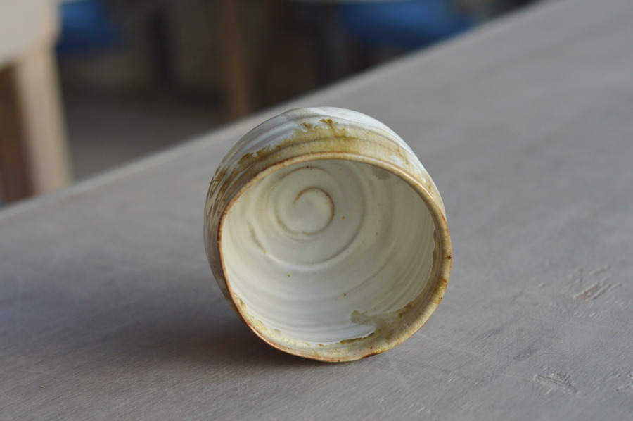 Tournage, tour à pied. Grès de Saint Amand en Puisaye, cuisson électrique. Émail de cendres et grès + émail blanc.
